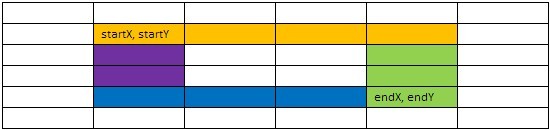 当遇到一个复杂的问题时,可以用图形辅助思考。由于是以从外圈到内圈的顺序依次打印,可以在矩阵中标注一圈作为分析目标。设矩阵的宽度为columns,高度为rows。选取左上角坐标为(startX, startY),右下角坐标为(endX, endY)的一个圈来分析。