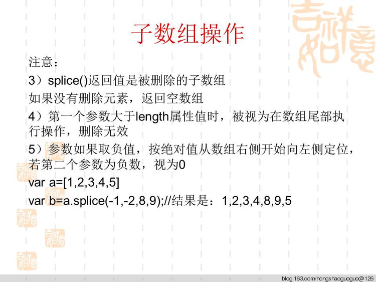 document.write(“<p>”+b[i]+”,”+b[i+1]+”,”+b[i+2]+”,”+b[i+3]+”,”+b[i+4]+”</p>”)