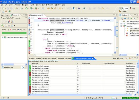 Coverlipse 是一个用于 Cobertura 的 Eclipse 插件,Cobertura 是一个代码覆盖率工具,可以用它来评估具有相应测试的源代码的比率。Cobertura 也提供一个 Ant 任务和 Maven 插件,但用 Cobertura,您可以在编写代码时 评估代码覆盖率。您见过这样的模式吗?