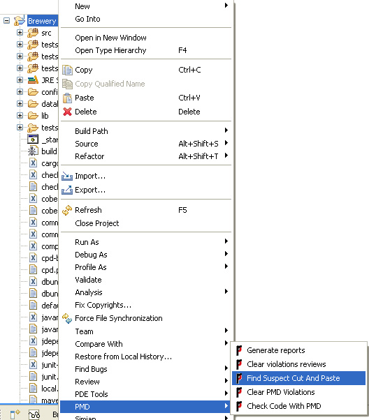 为寻找重复的代码,请用右键单击一个 Eclipse 项目并选择 PMD | Find Suspect Cut and Paste,如图 8 所示: