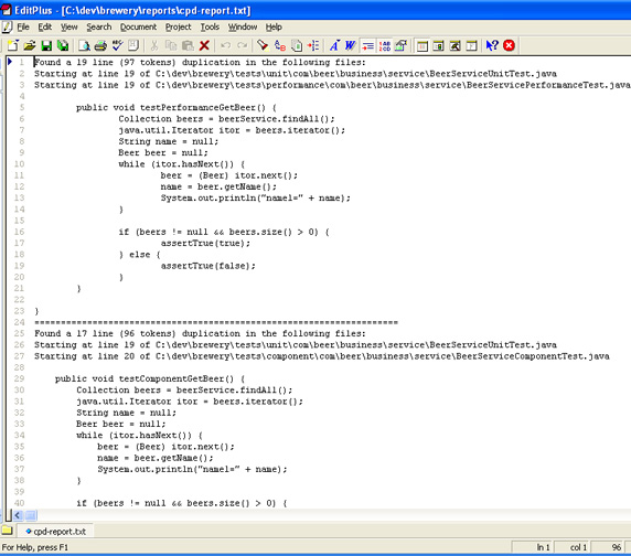 一旦运行了 CPD,您的 Eclipse 根目录下就会创建出一个 report 文件夹,其中包含一个叫做 cpd.txt 的文件,文件中列示了所有重复的代码。图 9 中是一个 cpd.txt 文件的例子: