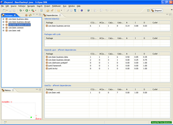 图 11 显示了运行 JDepend Analysis 时生成的报告。左边显示包,右边显示针对每个包的依赖项度量值。