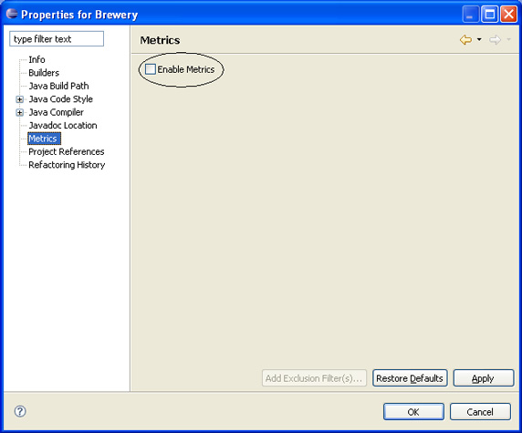 1、右键单击您的项目并选择 Properties 菜单。在结果窗口中,选择 Enable Metrics plugin 复选框并单击 OK,如图 12 所示: