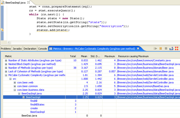 在此例中,我正在查看一个单独方法的圈复杂度。真正妙的是您可以双击 Metrics 列表中的方法,该插件会在 Eclipse 编辑器中为此方法打开源代码。这就让修正变得超级简单(如果需要的话)!