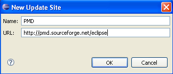 3、单击 New Remote Site,输入要安装的插件名和 URL(参见图 2),单击 OK,然后单击 Finish 来显示 Eclipse 更新管理器。