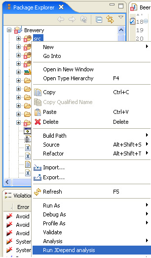 图 10 演示了使用 Eclipse JDepend 插件的方法:通过右键单击源文件夹并选择 Run JDepend Analysis。一定要选择一个含源代码的源文件夹;否则看不到此菜单项。