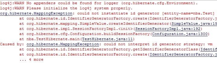 <?xml version="1.0"?><!DOCTYPE hibernate-mapping PUBLIC "-//Hibernate/Hibernate Mapping DTD//EN"<hibernate-mapping package="nba"> <class name="Test" table="test" > <meta attribute="sync-DAO">false</meta> <id name="Id" type="integer" column="id" > <generator class="vm"/> </id> <property name="Title" column="title" type="string" not-null="true" length="100" /> <property name="Content" column="content" type="string" not-null="true" /> </class> </hibernate-mapping> |
