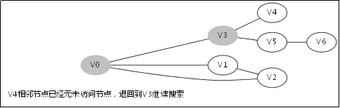 此后堆栈调用返回到V0那一层,因为V1那一层也找不到跟V1的相邻未访问节点