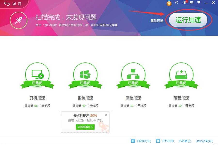 打开使用360安全卫士,点击左下方“优化加速”–>优化加速界面点击“开始扫描”–>扫描完成,点击“运行加速”