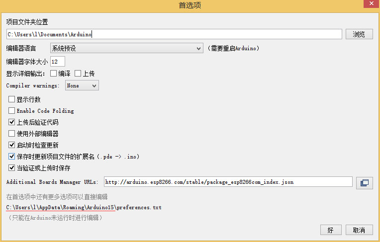首选项设置,在开发板管理器中(Addtional Boards Manager URLs)填入ESP8266的配置地址,红线中的是Arduino15存放的地点