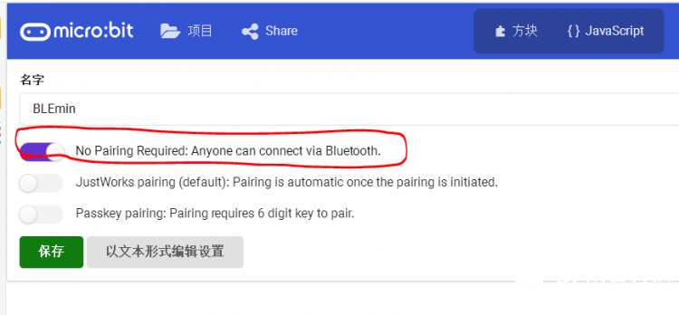建议蓝牙连接方式用免配对连接(不需要配对:任何人都可以通过蓝牙连接。),以节约调试时间,这个选择项是在makecode编程页面中找到的,前提是要在编程时添加https://github.com/LaboratoryForPlayfulComputation/pxt-blockytalkyBLE软件包。